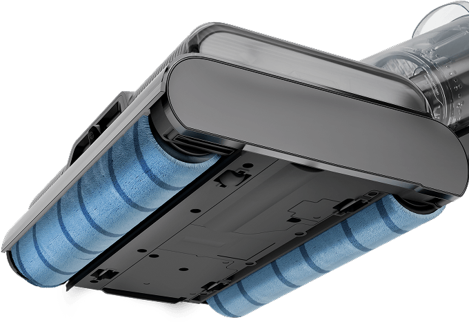 enquanto os rolos removem a sujeira do piso.