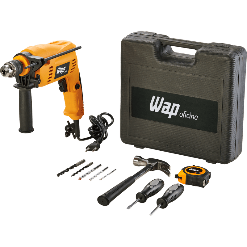 A Furadeira de Impacto WAP EFI600K10 é uma ferramenta completa, produtiva e muito confortável na hora de trabalhar. Além disso, ela vem com 11 acessórios incluindo punho auxiliar multidirecional, régua de profundidade, trena de 3 metros, chave Philips, chave de Fenda, brocas para madeira (6 e 8 mm), brocas para alvenaria (5, 6 e 8 mm) e martelo. Perfeita para um trabalho completo e organizado, tudo isso em uma maleta, facilitando o transporte e armazenamento da ferramenta. Além disso, conta com uma chave de mandril, para facilitar o aperto das brocas. Esta é uma solução da linha WAP oficina, 100% rolamentada, que oferece robustez e qualidade para atender os usuários mais exigentes. E para completar vem com a garantia de 1 ano assinada pela marca WAP!